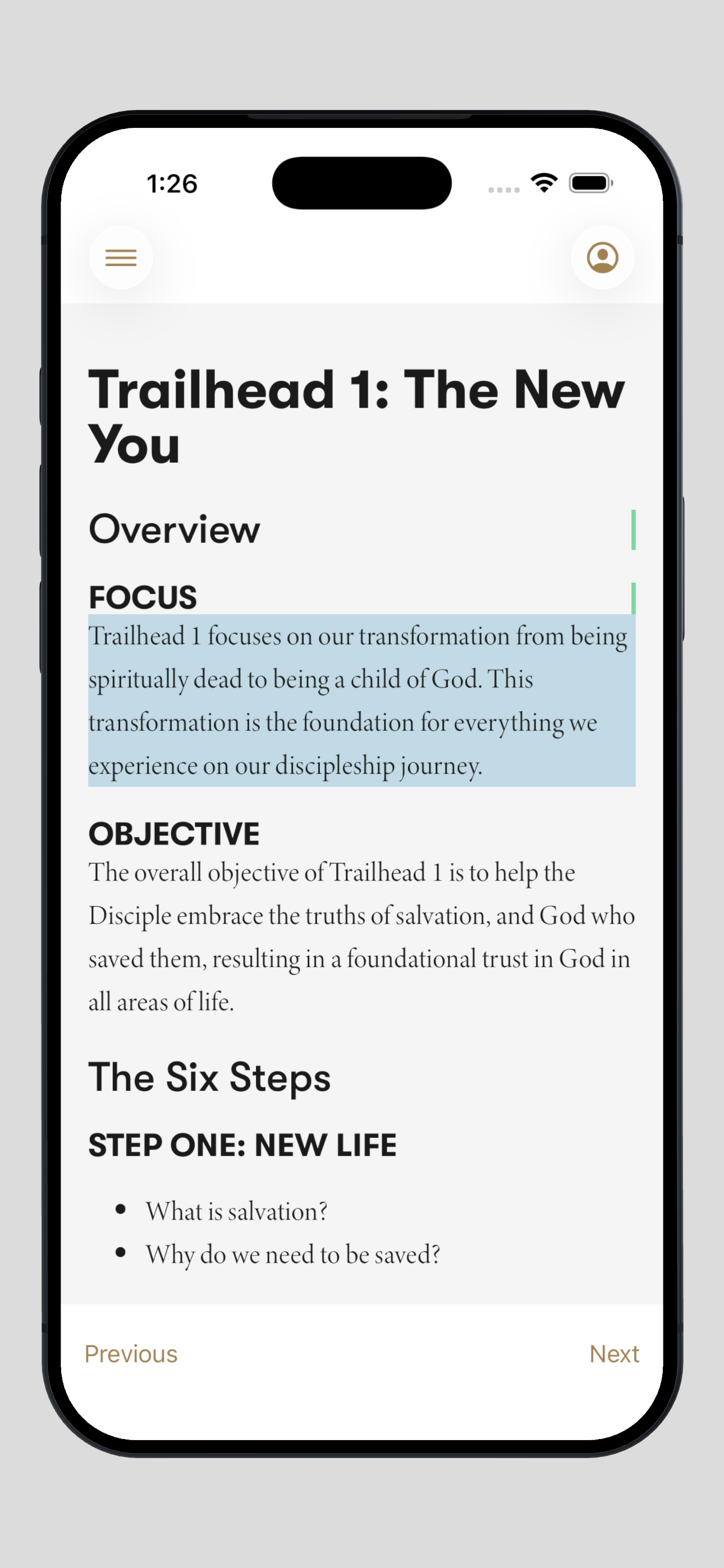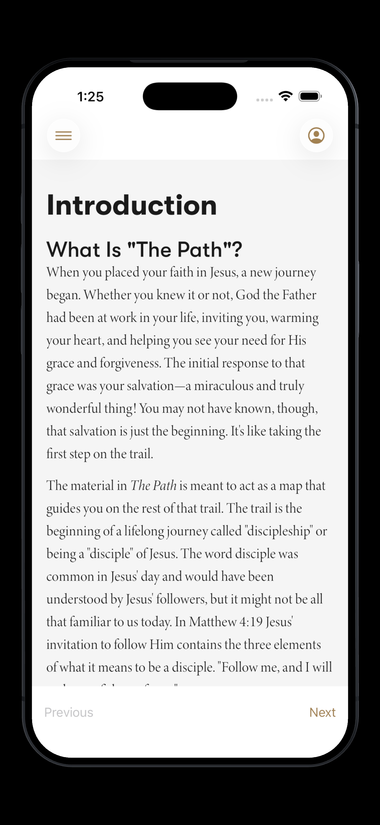 The Path discipleship material existed in print and PDF form, but Confluence churches needed a modern, interactive way to deliver it across both major mobile platforms. The app needed to: